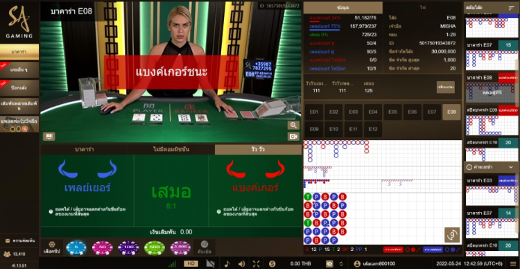 - วางเงินเดิมพันที่ Player ผลแต้มใบสุดท้าย P คือ 7 ต่อ B 8 แต้ม เมื่อลงเดิมพันที่ Player แต่ Player แพ้ จะมีการจ่ายยอดอยู่ที่ 800 บาท
